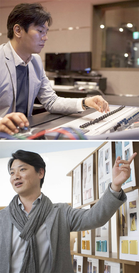 녹음 장비를 점검하고 있다. 아래쪽 사진은 삼성전자 스마트폰 컬러를 디자인하는 조성훈 디자인팀 책임이 컬러 트렌드를 설명하는