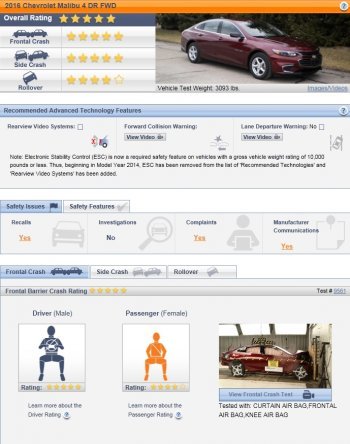 신형 말리부는 최근 미국 도로교통안전국(NHTSA)이 실시한 ‘2016 신차 평가 프로그램(New Car Assessment Program)’의 안전성 종합평가 부문에서 정면 충돌과 측면 충돌에서 별 다섯 개, 전복에서 별 4개를 획득해 종합 성적 결과 최고 등급인 별 5개로 안전성을 입증했다.