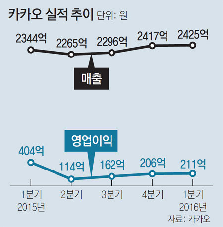 카카오 수익 모델의 가장 큰 비중을 차지하는 광고 매출에서는 전년 동기 대비 161억 원이 빠졌다. 카카오는 이날 실적 발표 콘퍼런스콜에서 “지난해 말부터 광고 부문 구조조정을 통해 효율이 낮은 부분들은 과감히 제거하고 있다”며 “장기적으로 광고 효율을 높이기 위한 작업으로 2분기부터는 회복세로 돌아설 것”이라고 설명했다.