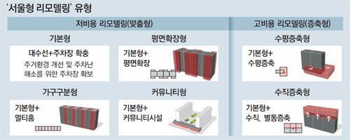 한편 부담금이 많아 집주인들이 사업을 꺼렸던 강북권의 노후 단지들도 리모델링을 추진할 수 있는 길이 열렸다. 시는 아파트에 도시 재생 개념을 결합한 ‘서울형 리모델링’ 사업을 추진하겠다고 밝혔다. 집주인이 내야 할 금융비용을 시가 지원해 주는 대신 리모델링을 통해 증축된 단지 주차장, 어린이집 등을 지역사회에 개방해 공유하는 방식이다.