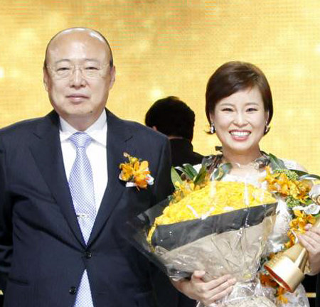 한화생명이 13일 경기 고양시 일산서구 킨텍스에서 ‘2016년 연도대상 시상식’을 개최했다. 최고의 상인 ‘여왕상’은 지난해 수입보험료(매출)로 180억 원을 돌파한 신울산지역단 다운지점의 정미경 영업팀장(오른쪽)이 수상했다. 시상식에 참석한 김승연 한화그룹 회장(왼쪽)은 “그룹의 주력사인 한화생명이 저성장 저금리 시대를 넘어 글로벌 리더 수준으로 도약해 나가야 한다”고 강조했다.
