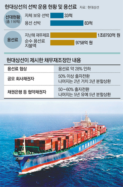 현대상선이 진행 중인 용선료 협상은 총 용선료의 28.4%(3년 6개월간 7200억 원)를 인하하는 것이 목표치인 것으로 알려졌다. 정부와 채권단은 현대상선의 용선료 협상 데드라인을 20일까지로 정하고 이때까지 결과를 내지 못하면 법정관리 수순을 밟겠다고 밝힌 바 있다. ○ 사채권 채무조정도 풀어야 할 과제