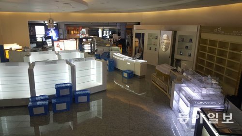 유리벽을 통해 매장을 들여다보니 텅 빈 진열대 아래 폐점 이후 재고를 운반할 파란색 상자만 여기저기 쌓여 있었다. SK네트웍스 관계자는 “15일까지 재고를 포장하는 작업을 마친 뒤 16일 면세점 공간을 완전히 비울 것”이라고 말했다.