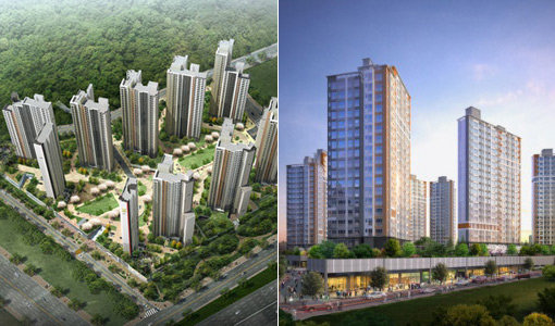 롯데건설이 수도권광역급행철도(GTX) 호재가 기대되는 경기 용인시 상미지구에 ‘신흥덕 롯데캐슬 레이시티’를 분양한다. 왼쪽 사진은 신흥덕 롯데캐슬 레이시티 조감도. 오른쪽 사진은 SRT 개통 시 수혜가 예상되는 동원개발의 ‘동탄2신도시 동원로얄듀크 1차’ 조감도. 사진제공|롯데건설·동원개발