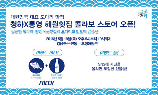 롯데주류가 19일 경남 통영의 맛집 ‘해원횟집’과 함께 ‘청하-해원횟집 콜라보 스토어’(사진)를 연다. 이번 ‘청하-해원횟집 콜라보 스토어’는 서울시 강남구 논현동에 위치한 ‘오징어청춘’ 매장에서 진행된다. 현장을 방문한 선착순 1000여명에게 도다리를 활용한 요리와 청하를 무료로 제공한다. 특히 이번 행사는 ‘경남 3대 횟집’으로 꼽히는 해원횟집의 레시피로 조리한 음식을 서울 한복판에서 맛볼 수 있다는 점이 화제가 되고 있다. 해원횟집은 통영 향토 음식과 자연산 활어회를 전문으로 하는 횟집으로 이명박 전 대통령, 크로아티아 대통령, 할리우드 스타 성룡, 소설가 고 박경리 등이 극찬한 경남지역 최고의 맛집으로 통한다. 19일 오후 5시에 문을 열어 밤 10시까지 운영된다.