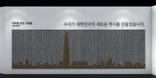 롯데물산은 서울 송파구 올림픽로 롯데월드타워 5층 홍보관에 ‘타워를 만든 사람들(Wall of Fame)’ 벽면을 조성했다고 22일 밝혔다. 공사 현장에서 100일 이상 근무한 사람의 이름 8000개를 가나다 순으로 모두 적고, 여기에 음영을 줘 롯데월드타워를 둘러싼 서울 잠실의 외관을 형상화했다. 벽면 위에는 “우리가 대한민국의 새로운 역사를 만들었습니다”라는 문구도 새겨 넣었다.