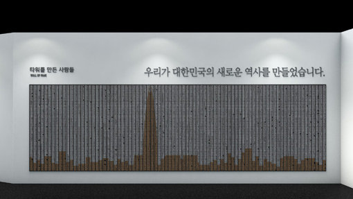 롯데월드타워(제2롯데월드)는 100일 이상 공사현장에서 근무한 근로자 7500여 명과 올해 12월까지 추가되는 근로자, 롯데물산 및 롯데건설 임직원 등 총 8000여 명의 이름을 롯데월드타워 5층 타워 홍보관 벽면에 새긴다. ‘타워를 만든 사람들(Wall of Fame)’(사진)이라는 제목 아래 8000여 명의 이름을 가나다순으로 적고, 가장 높은 곳에서 일한 근로자, 현장 최초 여성, 최장시간 근무, 국내 첫 민간 대테러 담당자 등 현장의 특이한 이력을 가진 사람들의 사진과 그들의 인터뷰를 실은 ‘자랑스러운 얼굴들’이란 공간도 마련한다.