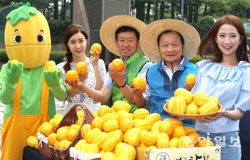 26일 서울 종로구 청계광장에서 열린 농산물 직거래 장터에서 농민들이 싱싱한 참외를 들어 보이고 있다. 농협중앙회는 자체 운영하는 인터넷 쇼핑몰인 ‘농협A마켓’을 통해 29일까지 참외 3kg을 1만 원(기존가 1만5000원)에 판매한다.