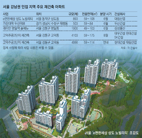 이달부터 강남권 인접 지역에서 재건축 아파트들이 연이어 분양에 들어간다. 대림산업은 이달 서울 동작구 상도동 대림아파트 등을 재건축한 상도1구역에서 ‘e편한세상 상도 노빌리티’를 분양할 예정이다. 지하 4층∼지상 29층, 전용면적 59∼108m² 893채 규모로, 이 가운데 406채가 일반에 분양된다.