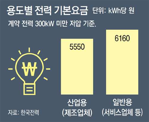 하지만 계약전력 300kW 미만인 소형 서비스업 사업장에는 여전히 차등적으로 요금을 매기고 있다. 저압전력(갑I) 기준으로 1kW당 기본요금은 △일반용 6160원 △산업용 5550원으로 서비스업체가 제조업체보다 10%가량 비싼 요금을 내고 있다. 기재부는 앞으로 300kW 미만 업체에 대해서도 전기요금 차별을 없애기로 방침을 세우고 산업부 등과 막바지 조율 작업을 벌이고 있다.