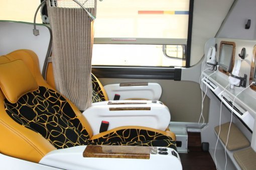 항공기 1등석을 연상케 하는 기아자동차의 ‘프리미엄 골드 익스프레스’는 좌석에 앉아 오른쪽 팔걸이의 ‘좌석 펼침’ 버튼을 누르자 등받이와 다리받침이 수평에 가까운 160도로 펼쳐졌다. 거의 드러누운 자세로 이동할 수 있는 것. 기존 우등버스는 좌석을 최대 139도까지만 기울일 수 있었다.