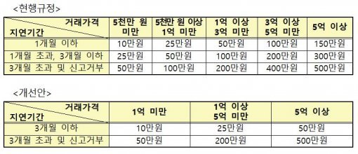또한 부동산 거래신고를 3개월 이내 지연 신고 시 지연기간, 거래가격에 따라 부과되는 과태료 액수를 종전 10만~300만 원에서 10만~50만 원으로 하향조정했다. 거래당사자의 단순 실수나 제도에 대한 이해 부족 등으로 지연신고를 하는 경우가 있었는데 이로 인한 과태료가 과도하다는 지적이 있어 이를 완화한 것.