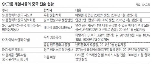 SK그룹은 이후 10년 동안 국내 기업 중 중국에 적극적으로 진출해 왔다. 석유화학과 반도체 등의 경우 2000년대 중반부터 펼친 ‘글로벌 파트너링’ 전략이 최근 2, 3년 사이 잇달아 결실을 맺고 있다. 성장 정체로 고민에 빠진 SK텔레콤과 SK플래닛 등 정보기술(IT) 계열사들도 다시 중국 시장을 두드리고 나섰다.