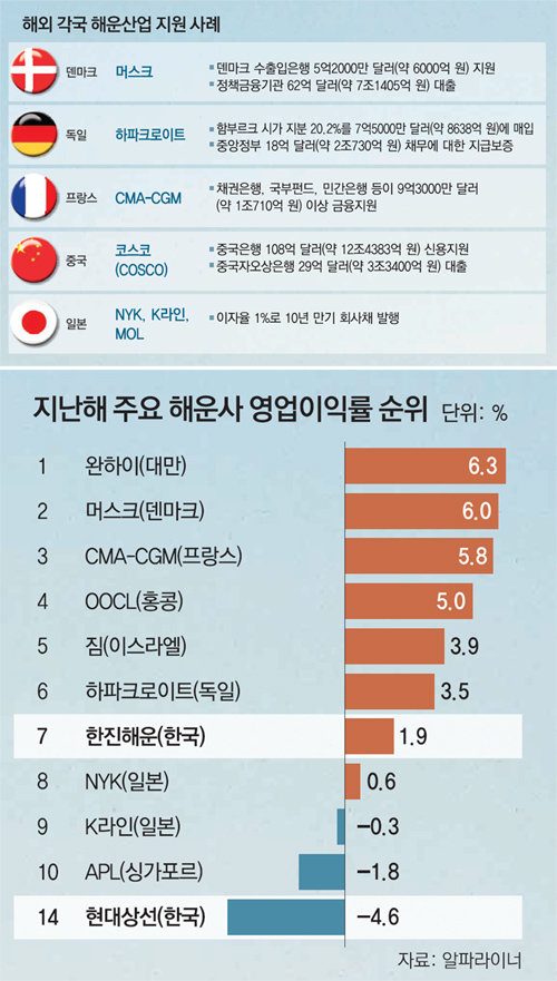 지금 ‘해운공룡’이 된 외국의 선사들은 이 같은 지원이 성공적으로 이뤄진 결과다. 2008년 세계 금융위기 이전까지만 해도 국내 해운사와 세계적 해운사 간의 적재능력과 영업이익률 차이는 크지 않았다. 하지만 위기 이후 정부의 대응이 차이를 갈랐다. 위기에 오히려 전폭적인 지원을 받고 대형선박을 확보한 외국 선사들은 원가경쟁력을 갖출 수 있었고, 빚을 줄이기 위해 가지고 있던 배도 팔아버린 국내 선사들은 수익성이 점점 더 나빠졌다.