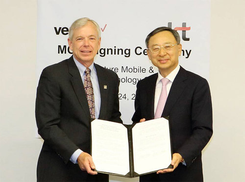 KT는 북미 최대 통신사 버라이즌과 24일(현지 시간) 미국 뉴저지 주 배스킹리지 버라이즌 본사에서 ‘5세대(5G) 이동통신을 포함한 미래 인프라 및 기술 협력에 대한 업무협약’을 체결했다고 밝혔다. 협약식에는 황창규 KT 회장(CEO)과 로웰 매캐덤 버라이즌 대표(CEO)가 참석했다.