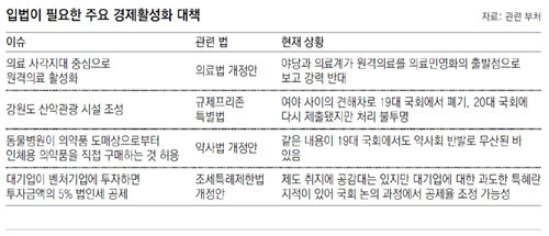 정부는 서비스경제 발전전략에서 섬, 벽지 등 의료 사각지대를 중심으로 의사와 환자 간의 원격의료를 허용하겠다고 했지만 의료법 개정안이 통과되지 않으면 불가능하다. 야당과 의료계는 원격의료가 의료민영화의 출발점이라며 강하게 반발하고 있어 법안 통과를 낙관하기 어렵다. 투자활성화 대책에 언급된 강원 대관령 일대의 한국판 ‘융프라우 산악열차’ 사업도 특정 지역에 적용되는 규제를 일괄적으로 풀어주는 규제프리존 특별법이 국회를 넘지 못하면 무산될 가능성이 크다.