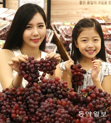 17일 서울 용산구 한강대로 이마트 용산점에서 모델들이 칠레산 적포도 품종인 토토라스를 선보이고 있다. 이 포도 품종은 고온 건조한 지역에서 자라 당도가 높은 것이 특징이다. 가격은 1팩(900g)에 6480원.