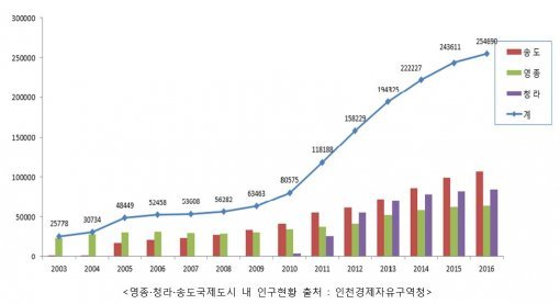 인천경제자유구역청에 따르면 영종·청라·송도국제도시의 인구는 올해 7월 말 기준 총 25만351명으로 지난 2003년(2만5778명)보다 971% 증가했다.