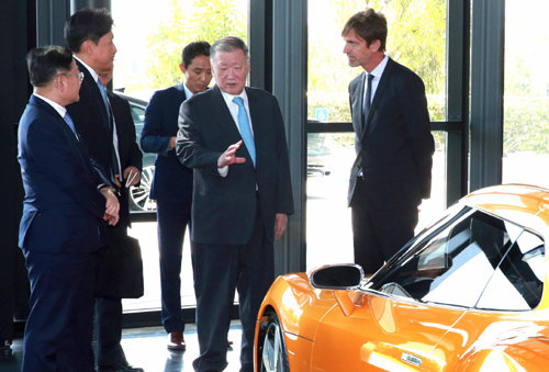 정몽구 현대자동차그룹 회장(오른쪽에서 두 번째)이 5일(현지 시간) 미국 캘리포니아 주 어바인 기아자동차 디자인센터를 방문해 톰 컨스 수석디자이너(오른쪽) 등 임직원들과 대화를 나누고 있다.