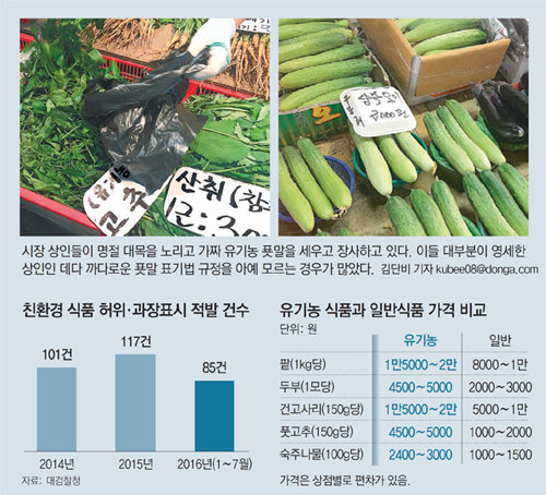 추석을 맞아 경찰이 허위·과장광고, 원산지 허위 표시 등 불량음식을 근절하기 위해 특별단속을 실시하고 있다. 동아일보 취재진이 서울시내 대형 전통시장 5곳을 돌아보니 가짜 유기농, 친환경, 무농약 농산물들이 버젓이 팔리고 있었다. 대검찰청에 따르면 가짜 유기농, 친환경 농산물을 판매한 혐의로 처벌 받은 건수는 2014년 101건에서 지난해 117건으로 늘었다. 올 상반기에만 85건이 적발됐다. 매출액이 월 500만 원 이하인 영세상은 통계에 포함되지 않아 그 수는 훨씬 많을 것으로 추산된다.