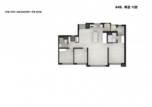 전용 84㎡B는 넓은 주방공간을 확보해 주방가구 레이아웃을 알파룸 타입, 팬트리 타입, 디럭스 타입 중 선택할 수 있다. 가변형 벽체를 적용해 가족의 수에 따라 개인공간을 더 만들거나(알파룸), 수납을 강화할 수 있고(팬트리), 가족의 생활공간으로 주방을 넓게 해 (디럭스) 사용할 수 있다. 부엌에 큰 창문을 내 거실과 맞통풍도 가능하다.