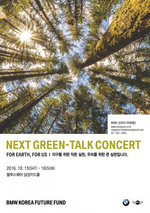 BMW코리아 미래재단이 오는 15일과 16일 양일간 서울 용산구에 위치한 블루스퀘어 삼성카드홀에서 ‘넥스트 그린-토크 콘서트(NEXT GREEN-TALK CONCERT)를 개최한다.