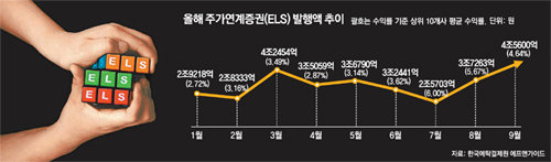 4일 한국예탁결제원에 따르면 지난달 증권업계의 ELS 발행액은 4조5600억 원으로 지난해 12월(7조6206억 원) 이후 최대 규모였다. 올해 초 H지수 폭락에 이어 브렉시트(영국의 유럽연합 탈퇴) 여파로 7월 ELS 발행액이 2조5703억 원까지 쪼그라들었던 것을 감안하면 두 달 만에 2조 원 가까이 발행액이 불어난 것이다.