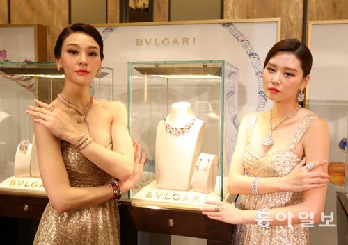 7일 서울 종로구 새문안로 포시즌스호텔에서 롯데백화점이 연 ‘불가리 하이 주얼리 이벤트’ 홍보 행사. 유리상자에 담긴 4억7000만 원대 목걸이 등 국내 최초로 공개되는 초고가 제품들이 13일까지 서울 중구 소공로 롯데백화점 본점 불가리 매장에서 전시, 판매된다.