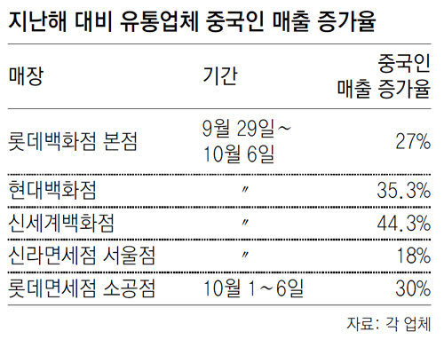 신세계백화점의 중국인 매출 신장률은 44.3%였다. 중구 남대문로 롯데면세점 소공점은 1∼6일 중국인 매출이 전년보다 30% 늘어났다. 서울 중구 동호로 신라면세점 서울점도 9월 29일∼10월 6일 중국인들이 구매한 금액이 18% 증가했다.