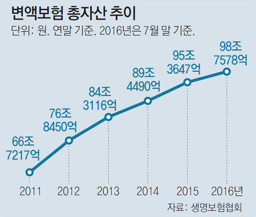 변액보험 시장은 꾸준히 성장하고 있다. 생명보험협회에 따르면 올해 7월 현재 변액보험 총자산은 98조7578억 원으로 집계됐다.
