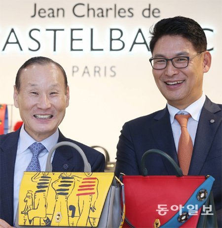 지난달 26일 오후 서울 강남구 학동로 까스텔바쟉 논현플래그십갤러리에서 최병오 패션그룹형지 회장(왼쪽)과 강수호 형지에스콰이아 대표가 까스텔바쟉 가방을 들고 밝게 웃고 있다. 김경제 기자 kjk5873@donga.com