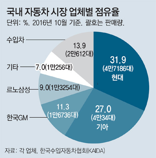 국내 자동차 시장 판매대수를 브랜드별로 나눠보면 현대차 점유율은 31.9%(4만7186대), 기아차는 27.0%(4만34대)로 총 58.9%를 기록했다. 2009년 두 회사는 내수시장의 80%를 차지할 정도로 점유율이 높았다. 하지만 점차 수입차가 국내 시장을 잠식하기 시작하면서 2010년 78.1%로 점유율이 내려갔고, 2014년엔 60%대에 진입했다.