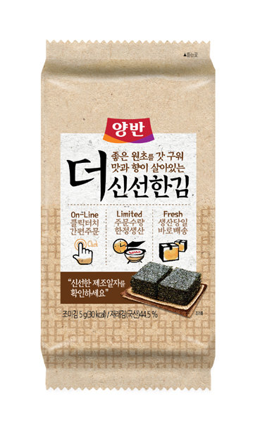 동원F&B(대표이사 김재옥)가 국내 최초로 주문 당일에 바로 구워 발송하는 특별한 김, ‘양반 더 신선한 김’을 출시했다. 온라인 주문 수량만 당일 생산해 발송하기 때문에 소비자가 최적의 신선도로 받아볼 수 있다. 국내산 원초를 양식 단계부터 제품 생산에 이르기까지 3중 관리 시스템으로 엄격하게 관리해 품질이 뛰어나다. 급속 건조를 통해 원초의 맛과 향을 살렸으며, 들기름을 발라 구워 고소한 풍미를 더했다. 동원F&B가 운영하는 식품 전문 온라인 쇼핑몰 동원몰에서는 ‘양반 더 신선한 김’ 출시를 기념해 30일까지 40% 할인 판매한다.