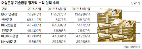올해 상반기 기업·신한·국민·우리·KEB하나·NH농협은행 등 6곳 중에서 기술금융 실적이 가장 좋은 기업은행은 약 90억 원(10%)의 인센티브를 챙길 수 있다. 꼴찌를 한 농협은 약 63억 원(7%)의 패널티를 물어야 한다. A은행 관계자는 “1, 2등은 인센티브를 받고 4∼6등은 패널티를 무는 식이어서 무조건 3등 안에 들어야 한다는 압박감이 크다”고 말했다.
