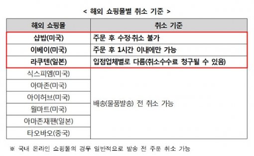 소비자원의 조사결과, 대부분의 해외 쇼핑몰은 물품 발송 전 취소가 가능하지만 ‘이베이’는 주문 후 1시간 이내에만 취소 가능하고, ‘샵밥’은 주문 후 수정 및 취소할 수 없으며, ‘라쿠텐’은 입점업체에 따라 취소수수료를 청구할 수 있다고 규정하고 있어 취소가 확정될 때까지는 재주문을 피해야 중복 결제 등 2차 피해를 예방할 수 있는 것으로 나타났다.