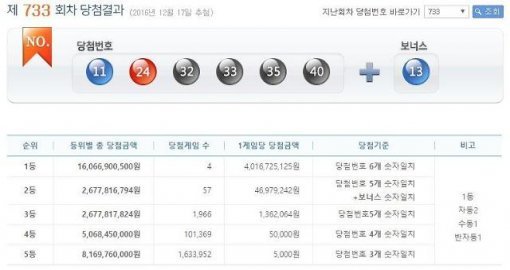 17일 추첨한 제733회 로또복권 1등 번호는 ‘11·24·32·33·35·40’이다. 2등 보너스 번호는 ‘13’이다.