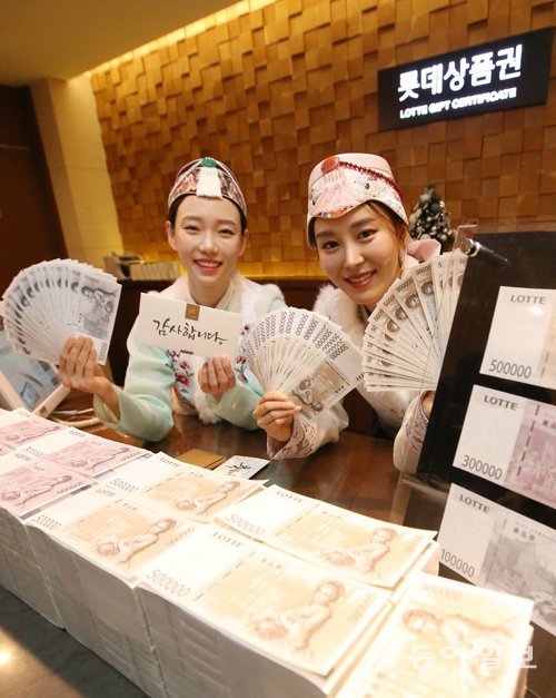 25일 서울 중구 남대문로 롯데백화점 본점에서 직원들이 ‘설 상품권 패키지’ 판매 홍보행사를 벌이고 있다. 롯데백화점은 26일부터 내년 1월 27일까지 300만 원 이상 상품권 구매 고객에게 구매액의 1∼3%에 해당하는 상품권을 사은품으로 증정한다.