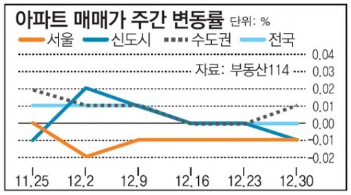 1일 부동산114에 따르면 2016년 마지막 주인 지난주 서울의 매매가격은 지난주 대비 0.01% 하락한 것으로 조사됐다. 강남권의 주요 재건축 아파트(―0.09%)가 약세를 보였고, 일반아파트(0.00%) 역시 관망세를 이어가고 있다. 자치구별로는 △송파(―0.12%) △강동(―0.07%) △양천(―0.07%) △서초(―0.03%) △강남구(―0.01%) 등이 하락했다. 1기 신도시는 0.01% 떨어졌고 경기·인천은 0.01% 올랐다.