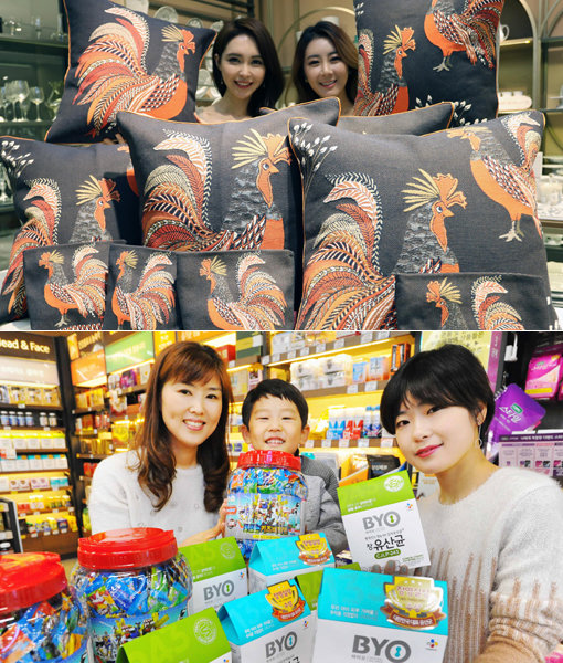 우선 2017 ‘닭의 해’를 맞아 ‘닭 마케팅’이 한창이다. 최근 신세계가 본점 7층 생활용품 편집숍인 피숀 매장에서 선보인 붉은 닭 문양이 들어간 쿠션과 파우치가 대표적. 프랑스 쿠션 전문 브랜드 ‘이오시스’ 제품으로 독특한 문양과 색상이 가미된 디자인이 특징이다. 가격은 쿠션 13만6000원, 파우치 7만8000원.