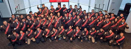 1일 오전 서울 송파구 올림픽로 롯데월드타워 118층 전망대에서 롯데물산과 건설 임직원 60여 명이 모여 ‘새해 해맞이 및 롯데월드타워 오픈 성공 결의대회’에 함께하고 있다. 이날 행사에 참석한 황각규 롯데그룹 정책본부운영실장(뒷줄 오른쪽에서 네 번째)은 “새해 롯데월드타워가 성공적으로 개장할 수 있도록 최선을 다해 달라”고 말했다.