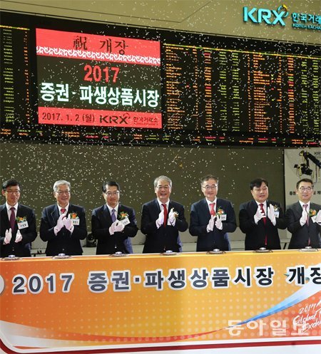 2일 서울 영등포구 여의도동 한국거래소 서울사옥에서 ‘2017 증권·파생상품시장 개장식’이 열렸다. 신경철 코스닥협회장, 황영기 금융투자협회장, 진웅섭 금융감독원장, 임종룡 금융위원회 위원장, 정찬우 한국거래소 이사장, 김진규 한국상장회사협의회 부회장, 김군호 코넥스협회장(왼쪽부터)이 참석해 박수를 치고 있다.