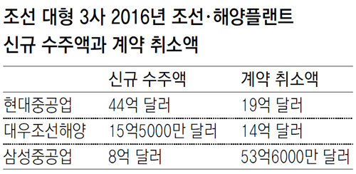 지난해 조선 빅3의 조선·해양플랜트 신규 수주액은 총 67억5000만 달러, 같은 기간 계약 해지 규모는 총 86억6000만 달러다. 조선 3사가 지난해 한 차례씩 낮춰 잡은 수주 목표액 173억 달러에도 한참 못 미치는 수주 실적을 올렸는데 ‘엎친 데 덮친 격’으로 계약 취소까지 잇따른 것이다.