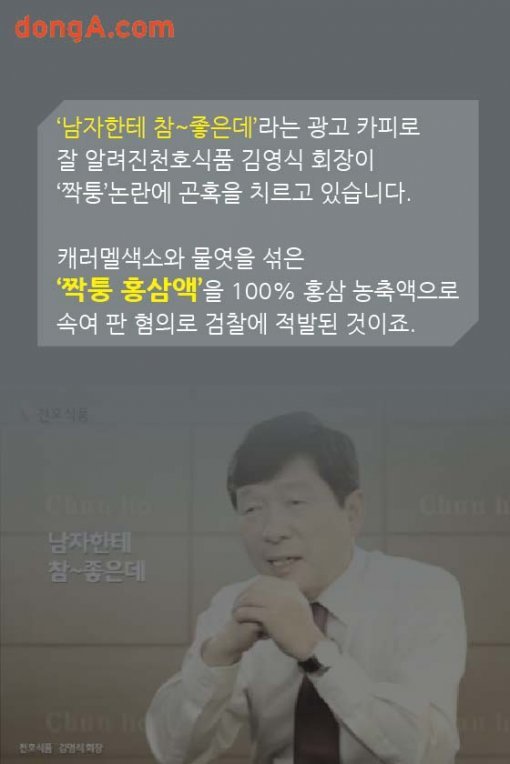 ‘남자한테 참~좋은데’라는 광고 카피로 잘 알려진 천호식품 김영식 회장이 ‘짝퉁’논란에 곤혹을 치르고 있습니다. 캐러멜색소와 물엿을 섞은 ‘짝퉁 홍삼액’을 100% 홍삼 농축액으로 속여 판 혐의로 검찰에 적발된 것이죠.