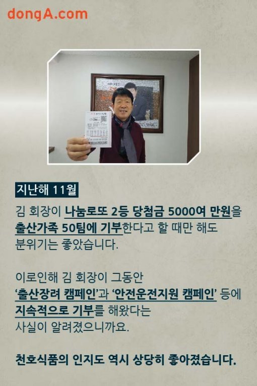 지난해 11월 김 회장이 나눔로또 2등 당첨금 5000여 만원을 출산가족 50팀에 기부한다고 할 때만 해도 분위기는 좋았습니다. 이로인해 김 회장이 그동안 출산장려 캠페인’과 ‘안전운전지원 캠페인’ 등에 지속적으로 기부를 해왔다는 사실이 알려졌으니까요. 천호식품의 인지도 역시 상당히 좋아졌습니다.