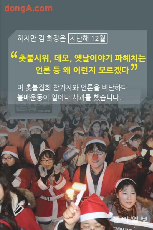 하지만 김 회장은 지난해 12월 “촛불시위, 데모, 옛날이야기 파헤치는 언론 등 왜 이런지 모르겠다”며 촛불집회 참가자와 언론을 비난하다 불매운동이 일어나 사과를 했습니다.