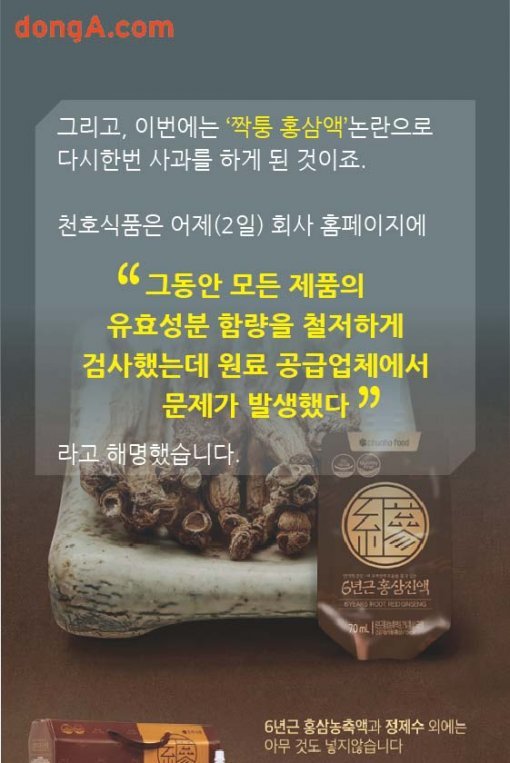 그리고, 이번에는 ‘짝퉁 홍삼액’논란으로 다시한번 사과를 하게 된 것이죠. 천호식품은 어제(2일) 회사 홈페이지에 “그동안 모든 제품의 유효성분 함량을 철저하게 검사했는데 원료 공급업체에서 문제가 발생했다”라고 해명했습니다.