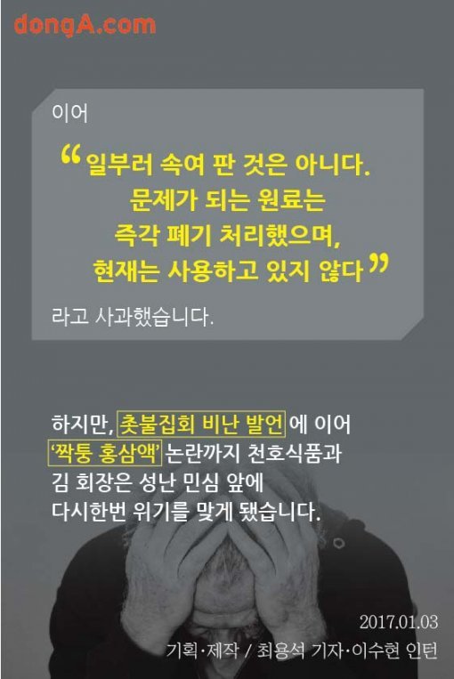 하지만, 촛불집회 비난 발언에 이어 ‘짝퉁 홍삼액’논란까지 천호식품과 김 회장은 성난 민심 앞에 다시한번 위기를 맞게 됐습니다.