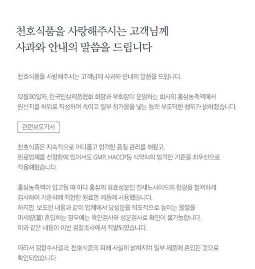 그러나 검찰조사 결과 거짓으로 밝혀졌다. 천호식품은 공식홈페이지를 통해 이 같은 내용을 알리고 사과했다. ‘고객님께 사과와 안내의 말씀을 드립니다’라는 제목의 사과문에서 “12월30일자 한국인삼제품협회 회장과 부회장이 운영하는 회사의 홍삼농축액에서 원산지를 허위로 작성해 속이고 일부 첨가물을 넣는 등의 부도덕한 행위가 밝혀졌다”고 공지했다. 천호식품은 “일부러 혹은 고의적으로 속여 팔았다는 내용은 전혀 사실이 아니다”고 주장했지만 소비자의 시선은 싸늘하다.