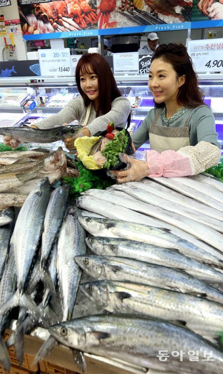 롯데마트는 5일부터 전국 매장에서 정부 비축 수산물 7.5t 물량을 갈치 6000원, 삼치 2300원 등의 가격에 판매한다고 3일 밝혔다. 이날 서울 중구 청파로 롯데마트 서울역점에서 모델들이 사전 홍보행사를 진행하고 있다. 정부 비축 수산물은 정부가 인기 어종을 미리 수매했다가 명절 등 수요가 급증하는 시기에 물가 안정을 위해 방출하는 것이다.