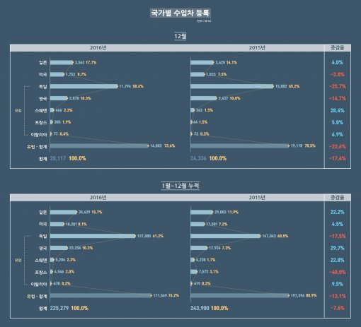 5일 한국수입자동차협회(KAIDA)에 따르면 2016년 수입차 신규등록대수는 총 22만5279대로 전년(24만3900대) 대비 7.6% 감소했다. 2016년 12월 수입차 월간 신규등록대수는 11월보다 3.9% 증가한 2만117대를 기록했다.